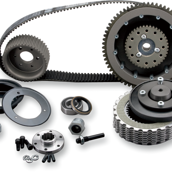Caracteristicas: 1-1/2" and 1-5/8" kits include front pulley, belt, clutch hub, clutch basket and aramid clutch set (consists of two half plates, four full plates and five steel drive plates) Direct bolt-in applications 3" electric start kit includes front pulley, belt, clutch hub and clutch basket and aramid clutch set (consists of two half plates, four full plates and five steel drive plates), 6061 T-6 billet motor plate, outside guard and polished pulley cover All systems come with the Quiet Clutch system Precision-machined, polished aluminum pressure plate uses nine springs and shoulder bolts to ensure even spring pressure (included in kit) Rear pulley has a 40mm, double-row bearing with an inner stress-proof steel clutch hub to support the clutch Made in the U.S.A. 3" system is not designed for use with floorboards. Not for use with offset primaries.