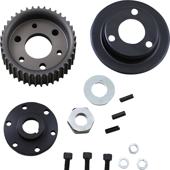 Caracteristicas: Tough, high-quality billet construction Pulley features bolt-in splined or tapered insert Includes belt guides and mounting hardware Hard anodized finish Made in the U.S.A. Made in the U.S.A.