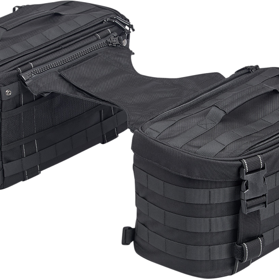 Caracteristicas: UV-treated 1680-denier ballistic nylon exterior resists moisture and fading Strong, flexible EVA foam panels inside main compartment add structure and durability MOLLE system on exterior provides options for attaching accessories and extra gear One main and two secondary compartments are secured with rustproof nylon zippers Zippered clamshell cover on main compartment locks closed with two 1.5-inch wide (36mm) reflective polyester straps and Duraflex quick-release buckles High-vis orange interior lining makes spotting contents easier 10” wide x 8” deep (254mm x 203mm) zippered pocket on clamshell top provides fast access to maps, smart phones, and other essentials Two-piece mounting yoke with adjustable hook and loop panel fastens to both bags with extra-large, heavy-duty nylon zippers Universal fit works with a variety of aftermarket saddlebag supports Multiple D-rings and MOLLE points on bag exterior provide options for carabiners/bungee cords Hidden cable port into main compartment—perfect for charging devices Waterproof nylon rain covers with elastic gathers and drawstring closure provide extra protection in extreme conditions