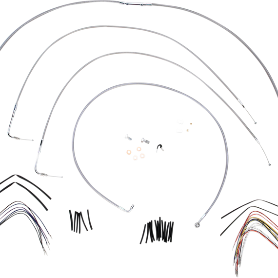 Caracteristicas: Complete installation kit for Burly Ape hangers Kits include extended brake line, extended clutch cable/clutch line, extended throttle/idle cables as required and all necessary wiring Brake lines feature PTFE inner liner and heavy-duty stainless steel outer braid Dresser kits reuse stock Throttle-By-Wire harness Kits are based on using 2" risers with ape hanger-style handlebars