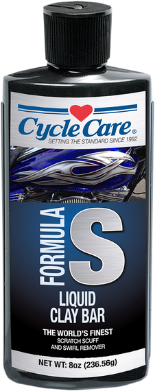 Caracteristicas: Cycle Care® Formula S is a specialty product designed to safely repair blemished areas on clear-coat surfaces Provides just the right amount of pumice blended with the correct amount of emulsifier to remove light scratches, scuffs, swirls, abrasions, water spots, tree sap and road tar Repairs clouded or oxidized clear-coated or painted surfaces Available in 8-ounce bottles, 6 per case Made in the U.S.A. Not a protective polish (after use, remember to apply a good preservative product such as Cycle Care® Formula 3 Windshield, Paint and Chrome Polish)