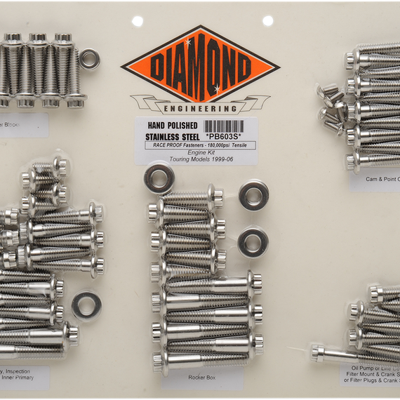Caracteristicas: Hand-polished stainless steel engine kits are designed to provide a custom and detailed look with easy installation Five groups of fasteners will detail all your engine covers with a lasting shine Diamond Engineering's special hex flange rocker box bolts are included for Twin Cam models Includes fasteners for primary, inspections and inner primary; cam and points; oil pump or oil line cover, filter mount and sensors (Dyna and Touring models) or oil filter plugs and sensors (Softail Twin Cam); lifter blocks; and rocker boxes Made in the U.S.A.