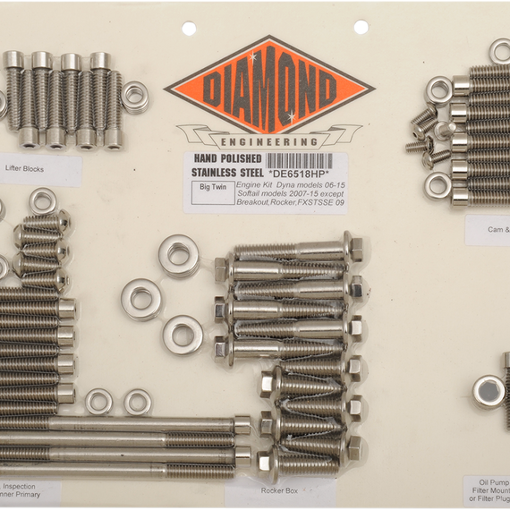 Caracteristicas: Hand-polished stainless steel engine kits are designed to provide a custom and detailed look with easy installation Five groups of fasteners will detail all your engine covers with a lasting shine Diamond Engineering's special hex flange rocker box bolts are included for Twin Cam models Includes fasteners for primary, inspections and inner primary; cam and points; oil pump or oil line cover, filter mount and sensors (Dyna and Touring models) or oil filter plugs and sensors (Softail Twin Cam); lifter blocks; and rocker boxes Made in the U.S.A.