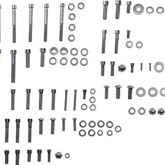 • Groups of polished stainless steel fasteners covering many visible areas of the motorcycle