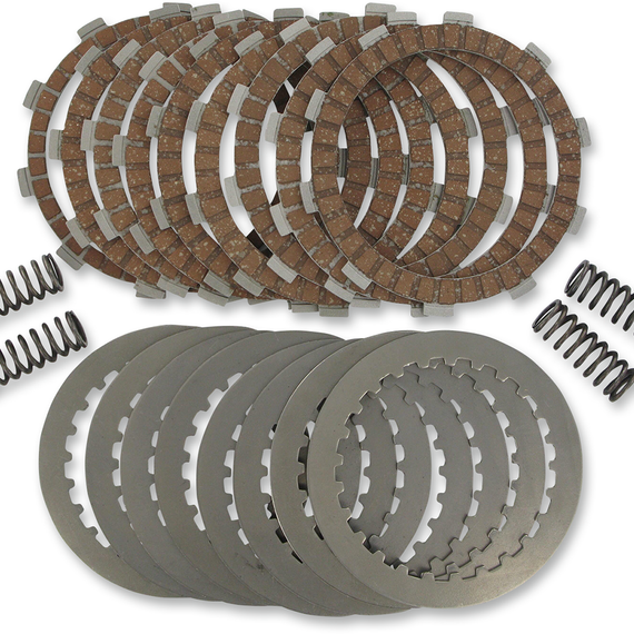 Caracteristicas: Get all the performance without all the fade or slip Get all the performance without all the fade or slip Friction plates are ready to fit - no need to pre-soak in oil Friction plates are ready to fit - no need to pre-soak in oil Designed to ensure ultra-smooth power delivery Designed to ensure ultra-smooth power delivery More durable than OEM clutch plates More durable than OEM clutch plates High-heat friction material for fade-free performance High-heat friction material for fade-free performance Clutch springs are shot-peened for maximum life, heat-treated and precision-wound using only the finest chrome silicon Clutch springs are shot-peened for maximum life, heat-treated and precision-wound using only the finest chrome silicon Springs are individually designed for each application to ensure easy operation and great feel at the lever Springs are individually designed for each application to ensure easy operation and great feel at the lever Kits available with or without steel friction plates Steel friction plates are precision-made using exacting tolerances Steel friction plates are precision-made using exacting tolerances Plates are heat-treated for maximum life Plates are heat-treated for maximum life Will not muddy or contaminate oil Will not muddy or contaminate oil Both styles of clutch kit include friction plates and springs (unless noted in part specific text)