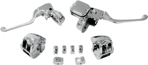 Caracteristicas: Kits include master cylinder assembly, clutch lever assembly, die-cast switch housings with radiused edges and OEM-style clamps Kits for 11-15 Softails/12-16 Dynas accept only OEM switches, all other kits accept 96-11 style switches and wiring (sold separately) Master cylinders accept OEM-style rebuild kits Not for use on models with cruise control