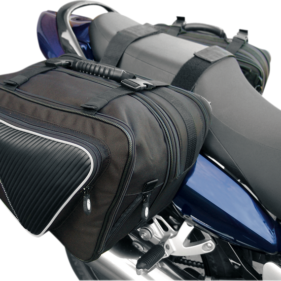 Caracteristicas: 1200-denier Technolast UV-treated polyester construction Two large front zippered pockets, two inside mesh pockets and exterior pockets for included rain covers Inner stiffeners Quick-release mounting system with adjustable hook-and-loop straps and under-seat center strap Heat-resistant base Measure 17" L x 10" W x 12" H (excluding pockets)