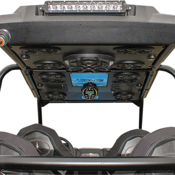Caracteristicas: Solid top with media options and features for convenience you never expected from your UTV The Audio Shade also comes with built-in LED light bars, interactive interior lights, and other convenient features to complete your off-road adventure, day or night Front 31" 150W sleek, high output single row LED light bar Rear 11" 50W sleek, high output single row LED light bar RBG LED interior light kit includes 4 lights Phone app-controlled (iPhone® & Android® compatible) - Lights dance to the beat of your music Backlit switches for light bars & interior lights - easily control your lights at night Kicker® KMC2 multimedia gauge-style marine receiver with Bluetooth® Bluetooth® audio streaming AM/FM digital tuner USB input, USB charging, RCA aux input (headphone jack), dual pre-amp outputs Kicker® 6.5" PS-Series speakers with titanium tweeters featuring neodymium magnets for high power with low weight Kicker® COMPRT 10" 400 W, 1 Ohm Subwoofer (on applicable models) - features ultra-thin design, dual voice coil, Extra large surround roll for deeper and smoother bass 500 watt Kicker® PX series mono subwoofer amplifier (on configurations with sub) 300 watt Kicker® PX series 4 x 75 watt full-range amplifiers (standard on all models) - weather resistant(IP66 rating) and active crossover Hand-laid reinforcement layered with directional fiber orientation for ultimate rigidity and strength, styled to match the bodywork Rigid design improves sound quality for the cleanest bass and crispest highs Strengthened edges to protect from tree branch strikes All cage clamp fasteners hidden on the top side for a smooth yet aggressive design (2) zipper pockets Hoppe Liner Coating for durable, all-weather protection