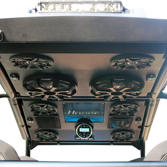 Caracteristicas: Solid top with media options and features for convenience you never expected from your UTV The Audio Shade also comes with built-in LED light bars, interactive interior lights, and other convenient features to complete your off-road adventure, day or night Front 31" 150W sleek, high output single row LED light bar Rear 11" 50W sleek, high output single row LED light bar RBG LED interior light kit includes 4 lights Phone app-controlled (iPhone® & Android® compatible) - Lights dance to the beat of your music Backlit switches for light bars & interior lights - easily control your lights at night Kicker® KMC2 multimedia gauge-style marine receiver with Bluetooth® Bluetooth® audio streaming AM/FM digital tuner USB input, USB charging, RCA aux input (headphone jack), dual pre-amp outputs Kicker® 6.5" PS-Series speakers with titanium tweeters featuring neodymium magnets for high power with low weight Kicker® COMPRT 10" 400 W, 1 Ohm Subwoofer (on applicable models) - features ultra-thin design, dual voice coil, Extra large surround roll for deeper and smoother bass 500 watt Kicker® PX series mono subwoofer amplifier (on configurations with sub) 300 watt Kicker® PX series 4 x 75 watt full-range amplifiers (standard on all models) - weather resistant(IP66 rating) and active crossover Hand-laid reinforcement layered with directional fiber orientation for ultimate rigidity and strength, styled to match the bodywork Rigid design improves sound quality for the cleanest bass and crispest highs Strengthened edges to protect from tree branch strikes All cage clamp fasteners hidden on the top side for a smooth yet aggressive design (2) zipper pockets Hoppe Liner Coating for durable, all-weather protection