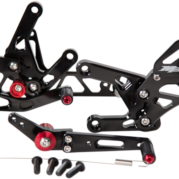 Caracteristicas: CNC machined from aircraft grade T6 6061 billet aluminum Fully adjustable to suit your riding style Mounting bracket and brake light switch spring included Supports OEM brake light switch Fully assembled and easy to install Knurled foot pegs with plastic caps Most applications can be converted to GP shift Complete kit - no additional parts required Ships fully assembled