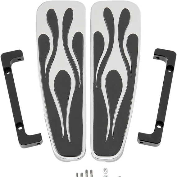 Caracteristicas: Provide better rider comfort by improving foot and leg positioning Five quick adjustment positions to suit your needs Increased leg room improves leg and knee comfort Expanded foot positioning is provided by 13" length, tapering from 4" wide down to 2-3/8" Narrowed design allows for greater lean angles without the risk of touching down Polished and chromed billet aluminum construction Include stylized vibration-reducing rubber inlays and replaceable rub strips and rubber pads Easy to install Made in the U.S.A.
