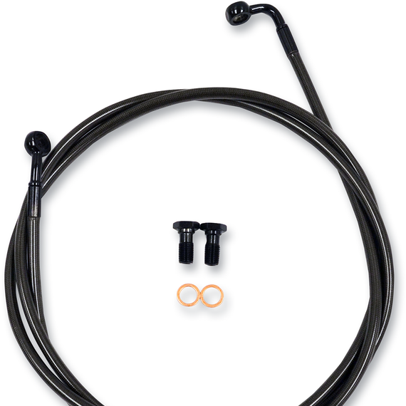 • Include stainless steel brakes, cables and lines covered in a black smoke tinted coating with pure black fittings throughout; lines appear graphite or carbon fiber in appearance providing that ultra custom look and the black fittings seamlessly blend with blacked out controls and covers on the bike