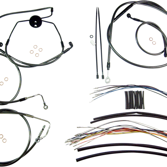 Caracteristicas: The only complete kits with matching braided cables and brake lines Kits include throttle and idle cables of throttle-by-wire extensions, clutch cable or hydraulic clutch line, brake lines, copper crush washers, hardware, and any necessary switch wiring of turn signal extension All cables are a low-effort, high-efficiency design that meets or exceeds all OE specifications for fitment, construction, endurance Kits for dual disc models include an all brazed manifold that eliminates leaks, alignment problems and unattractive threaded connections Assembled in the U.S.A. Kits are based on using ape hanger style handlebars with 2†risers