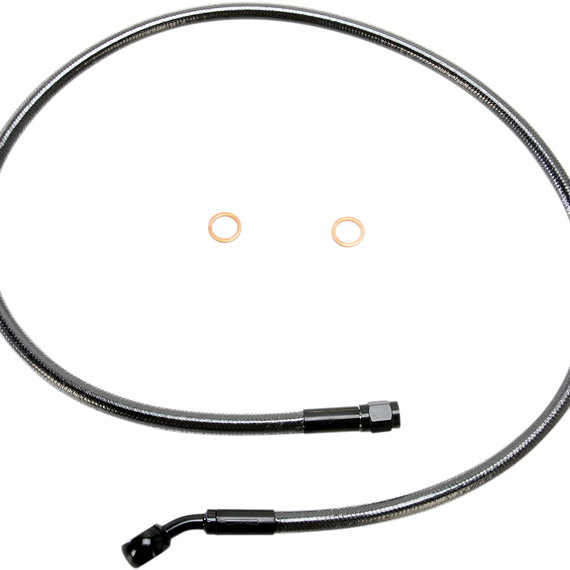 Caracteristicas: Manufactured with an enhanced construction designed to be compatible with Harley-Davidson ABS requirements for stock and alternate length brake lines - designed to follow the same routing path as OEM lines Brake kits consist of a direct fit lower assembly used in conjunction with alternative length upper lines Braid color and weave match all MAGNUM control cables and brake lines - Crystal clear outer jacket offers exceptional protection against scuffing paint or chrome and will never discolor Brake lines are constructed with PTFE inner tubing, DuPont™ Kevlar® aramid fiber, premium Signature Magnum braids and an outer PVC jacket to greatly reduce line expansion Upper, lower, mid brake line and adapter kits are sold separately to for a perfect fit. Compliant with all DOT FMVSS-106 requirements Assembled in the U.S.A. DuPont™ and Kevlar® are trademarks or registered trademarks of E.I. du Pont de Nemours and Company. Single disc Dyna and Sportster models use two kits – one upper and one lower. Softail models utilize 3 kits (except '18+ dual disc), with the lower being optional on all. Upper kits are required for handlebar changes; by using either an upper brake line adapter or for '11 - '17 Softail models, the optional ABS Lower Brake Line Kit which includes the adapter. Adapter for Softail models allows the upper brake line to complete the connection from the ABS controller ('11 - '17) or lower brake line ('18+) to the master cylinder If replacing the stock lower brake line assembly on '18+ dual disc Softails, an adapter is NOT needed. Using AN-3 fittings, the upper line connects directly to the Magnum lower assembly Dual disc Touring models use three kits - one upper, one lower and one mid-line. Trike models use two kits - one upper and one mid-line. No lower is available. A Designer mid-line and upper line is required for all Touring and Trike models with ABS. The mid-line connects to the upper brake line in the fairing or nacelle and completes the routing from the master cylinder to the ABS controller. A lower kit is optional. Non-stock applications require taking a measurement for upper brake line length and banjo angle to ensure correct fitment (see How to Order) Harley-Davidson motorcycles equipped with ABS (anti-lock brake system) require ABS specific upper and lower brake line kits. Failure to do so may result in compromised anti-lock braking ability. Magnum Shielding upper brake line kits manufactured specifically for these applications are identified with the letters “ABS” printed directly on the brake hose. Upper line length for Softail, Dyna, and '14+ Sportster models is determined by using your stock OE master cylinder brake line as a guide. Pull the rubber boot back and measure from the point at which the soft, flexible line enters the crimp collar on the lower portion. Follow the brake line routing up to your master cylinder. (see diagrams below) '18+ Softail – Upper line replacement when reusing the stock lower brake line. (adapter required) Lengths are determined by using the stock master cylinder line for a guide. Measure from the lower brake line manifold where the upper line attaches, up to the master cylinder. From that measurement subtract 1.5” for the adapter and round up to the next number to determine upper line length. (see diagram below) '18+ Softail Single Disc Upper and Lower line replacement requires an adapter. (3 kits) Adapter is NOT needed when replacing both the Upper and Lower '18+ Softail Dual Disc brake lines. (2 Kits) The upper line connects directly to the Magnum Designer dual disc lower brake line. Follow the above instruction without subtracting 1.5” for the adapter. Rounded up, the length measured will be correct. Upper line length for Touring and Trike models is measured using the 49" mid-line as a reference to determine additional line length needed to complete the routing from the ABS controller to the master cylinder. That measurement will be your upper line length.