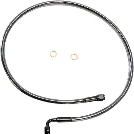 Caracteristicas: Manufactured with an enhanced construction designed to be compatible with Harley-Davidson ABS requirements for stock and alternate length brake lines - designed to follow the same routing path as OEM lines Brake kits consist of a direct fit lower assembly used in conjunction with alternative length upper lines Braid color and weave match all MAGNUM control cables and brake lines - Crystal clear outer jacket offers exceptional protection against scuffing paint or chrome and will never discolor Brake lines are constructed with PTFE inner tubing, DuPont™ Kevlar® aramid fiber, premium Signature Magnum braids and an outer PVC jacket to greatly reduce line expansion Upper, lower, mid brake line and adapter kits are sold separately to for a perfect fit. Compliant with all DOT FMVSS-106 requirements Assembled in the U.S.A. DuPont™ and Kevlar® are trademarks or registered trademarks of E.I. du Pont de Nemours and Company. Single disc Dyna and Sportster models use two kits – one upper and one lower. Softail models utilize 3 kits (except '18+ dual disc), with the lower being optional on all. Upper kits are required for handlebar changes; by using either an upper brake line adapter or for '11 - '17 Softail models, the optional ABS Lower Brake Line Kit which includes the adapter. Adapter for Softail models allows the upper brake line to complete the connection from the ABS controller ('11 - '17) or lower brake line ('18+) to the master cylinder If replacing the stock lower brake line assembly on '18+ dual disc Softails, an adapter is NOT needed. Using AN-3 fittings, the upper line connects directly to the Magnum lower assembly Dual disc Touring models use three kits - one upper, one lower and one mid-line. Trike models use two kits - one upper and one mid-line. No lower is available. A Designer mid-line and upper line is required for all Touring and Trike models with ABS. The mid-line connects to the upper brake line in the fairing or nacelle and completes the routing from the master cylinder to the ABS controller. A lower kit is optional. Non-stock applications require taking a measurement for upper brake line length and banjo angle to ensure correct fitment (see How to Order) Harley-Davidson motorcycles equipped with ABS (anti-lock brake system) require ABS specific upper and lower brake line kits. Failure to do so may result in compromised anti-lock braking ability. Magnum Shielding upper brake line kits manufactured specifically for these applications are identified with the letters “ABS” printed directly on the brake hose. Upper line length for Softail, Dyna, and '14+ Sportster models is determined by using your stock OE master cylinder brake line as a guide. Pull the rubber boot back and measure from the point at which the soft, flexible line enters the crimp collar on the lower portion. Follow the brake line routing up to your master cylinder. (see diagrams below) '18+ Softail – Upper line replacement when reusing the stock lower brake line. (adapter required) Lengths are determined by using the stock master cylinder line for a guide. Measure from the lower brake line manifold where the upper line attaches, up to the master cylinder. From that measurement subtract 1.5” for the adapter and round up to the next number to determine upper line length. (see diagram below) '18+ Softail Single Disc Upper and Lower line replacement requires an adapter. (3 kits) Adapter is NOT needed when replacing both the Upper and Lower '18+ Softail Dual Disc brake lines. (2 Kits) The upper line connects directly to the Magnum Designer dual disc lower brake line. Follow the above instruction without subtracting 1.5” for the adapter. Rounded up, the length measured will be correct. Upper line length for Touring and Trike models is measured using the 49" mid-line as a reference to determine additional line length needed to complete the routing from the ABS controller to the master cylinder. That measurement will be your upper line length.