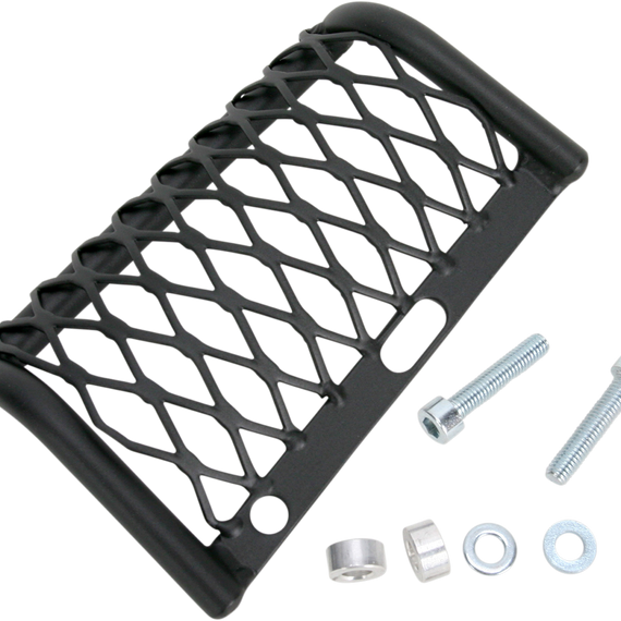 Caracteristicas: This guard will protect the exposed rear brake master cylinder from damage Light weight and does not interfere with boot placement on the footpeg Fabricated from mild steel and expanded metal Powder-coated flat black Easy installation with all required hardware provided Made in the U.S.A.