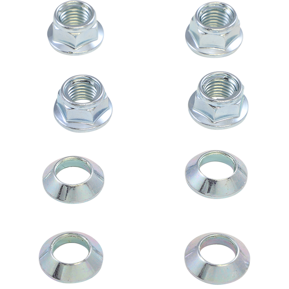 Caracteristicas: Tapered bushings (included) adapt nuts to replace tapered lugs when necessary Includes eight M10, metal-locking flange nuts that won't vibrate loose Work for flat and tapered lug nut applications Narrow enough to fit all aftermarket wheels