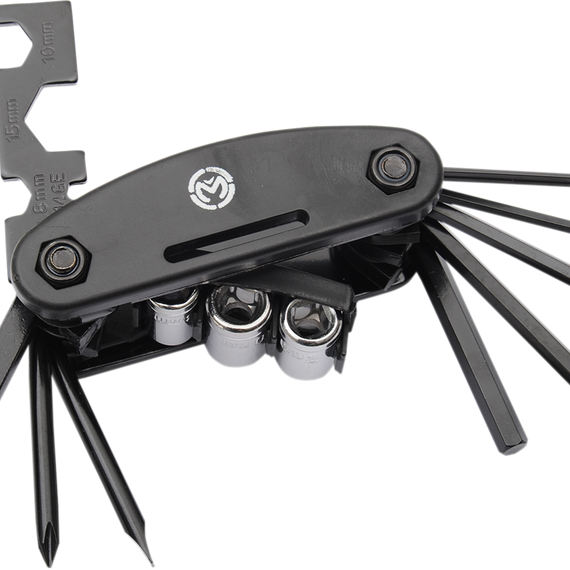 Caracteristicas: Folding tool includes 2 mm, 2.5 mm, 3 mm, 4 mm, 5 mm, 6 mm hex wrenches; 8 mm, 10 mm and 12 mm sockets; 8 mm, 10 mm and 15 mm open end wrenches, Phillips screwdriver, and slotted screwdriver Stored in a nylon pouch with belt attachment