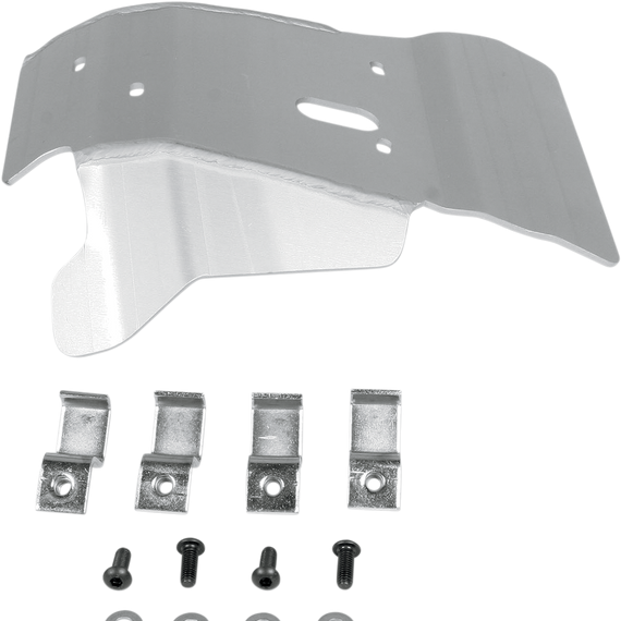 Caracteristicas: Protect vital engine parts and cases from rocks and debris Clear anodized for corrosion protection and good looks Skid plates made from 3/16" 5052 H-32 aluminum Smooth underside won't snag when crossing logs Oil drain hole on all required models Heat-treated chromoly steel clamps keep plates mounted securely All mounting hardware included Made in the U.S.A.