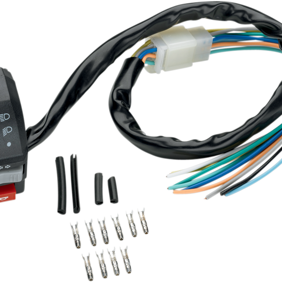 Caracteristicas: Has 9-pin connector Functions: headlight on/off, headlight high/low, directional switch, horn or kill switch, high beam LED indicator Switch Specs: 28.5 mm wide housing, wire length is 21.5"