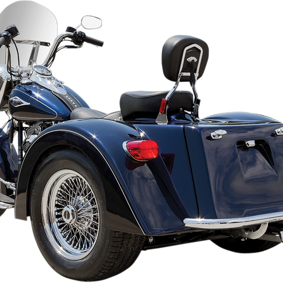 Caracteristicas: Complete bolt-on application, no welding or fabrication required Independent rear suspension features automotive bushings that insulate the chassis from driveline and suspension vibrations Air ride suspension with on-board compressor LED air suspension and voltmeter readout gauges Designed for stock exhaust but fits with most aftermarket exhaust systems with minimal modifications All Motor Trike conversions can be configured to work with stock tour trunks, backrests, or without either as applicable by model Progressive coil-over shocks with 4” plus wheel travel 12” disc brakes with multi-piston calipers Polyester resin fiberglass body Retains and utilizes the stock belt and drive pulley 15” polished aluminum torque thrust wheels with tires Utilizes stock taillight; additional taillight supplied for opposite fender Includes installation instructions Part Numbers listed are for Basic kits. Additional components as well as accessories and paint are not included. Contact Motor Trike for more details.