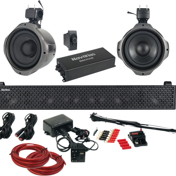 Caracteristicas: Rocker switch bluetooth control 6-1/2” amplified roll-cage speaker system 10” amplified under-seat subwoofer Installation kit with 60A circuit breaker