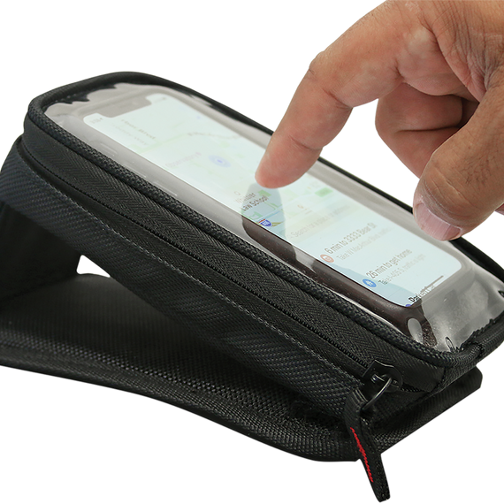 Caracteristicas: Can be adjusted to different positions for sun glare and optimal viewing Inner sleeves to hold credit cards, license and small documents Protective base material prevents slipping or marking Innovative Ultra Max™ durable polyester material Reverse coil zippers help keep out dust and dirt Attaches to metal tanks with strong magnets Clear top is touch screen device friendly Sized to fit all current plus size phones Highest UV protection in the industry Dimensions: 6.5" L x 3.5" W x 1.25" D