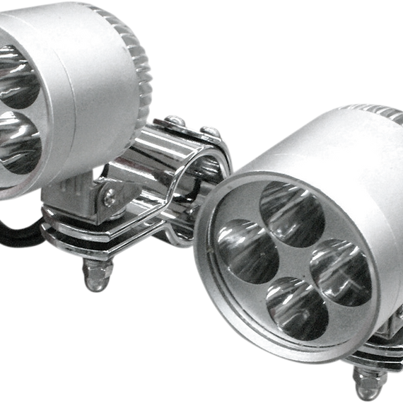 Caracteristicas: Increases visibility with 30 watt, 3000 lumen driving lights Compact set mounts on any 1-1/4" engine guard and handlebars; will also work inside fairings or on a light bar Features silver anodized aluminum housings and swivel mounts with 6mm bolts Kit includes: lights, 1-1/4" clamps, switch, relay, and all wiring Works on any 12 volt system Simple to follow instructions
