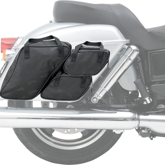 Caracteristicas: Four-piece liner set includes one full-size liner bag matched perfectly to the shape of your GL1800 saddlebag, plus one vertically oriented half-sized liner used in conjunction with two quarter-sized horizontally oriented liner bags that stack neatly together in your other saddlebag. Unique design permits efficient organization of your belongings – separate your laundry or keep rider and passenger gear divided while maximizing the capacity of your saddlebags. Top sections of the quarter-sized liner bags are transparent with double-pull zippers so you can see the contents and get to them quickly – perfect for items you need to grab when you're on the road. Made from our durable 150D logo stamped fabric with sturdy zippers that permit over packing but keep the elements away from your cargo. Great for trips, overnighters, organizing your tools or cleaning supplies. Simply lift your liners out of the saddlebags to move your cargo easily into the hotel, campground or to unload fast once you're home. Complete Set Measures: 16" x 5-1/4" x 9-1/2" (larger liner); 7-1/2" x 5-1/2" x 10-1/2" (medium liner); 7-1/2" x 5-1/2" x 4-1/2" (small liner)