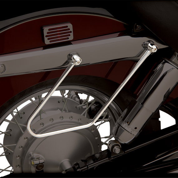 Caracteristicas: Chrome steel supports mount to rear fender bracket with new hardware Holds saddlebags away from brake caliper, swing arms and rear tire No drilling required Additional hardware may be required to install if an aftermarket backrest has been installed.