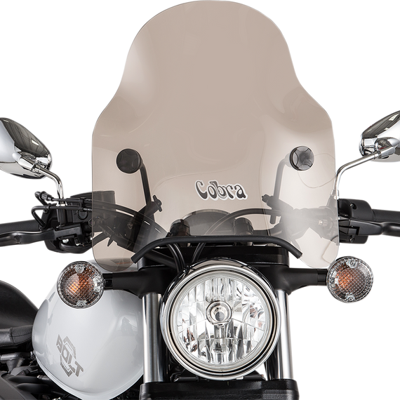 Caracteristicas: Curved looks and distinctive styling make the Cobra the striking leader in small fairing protection Exclusive anodized aluminum disc hardware system allows windshield to be taken off and put back on in seconds; fully adjustable for height and angle Fits either a round or square headlight