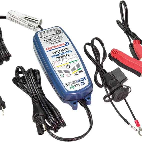Caracteristicas: The OptiMate 2 smart charger-maintainer is a cost-effective solution for long-term maintenance of 12V batteries in any vehicle that is stored indoors or outdoors Weatherproof and very easy to use: simply connect to the battery and plug it into the nearest power socket; the rest is fully automatic With 0.8A constant current OptiMate 2 automatically brings the battery to full charge and then switches to the unique OptiMate battery-saving maintenance charge mode to keep the battery at 100% ready, and at the same time provides power to the on-board computer, display or antitheft alarm Recommended for STD (with removable filler caps), sealed AGM (absorbed glass mat) and sealed gel 12V lead-acid batteries up to 50Ah Weighs in at 1 lb. Includes permanent ringlet connector with weatherproof cap and a set of battery clips Fully automatic operation that includes all safety features such as reverse polarity protection, no spark connection; approved to UL and CSA safety standards for automatic battery chargers