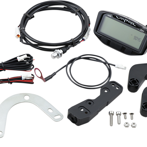 Caracteristicas: Speed, temperature, distance, tachometer and clock Speedometer functions: current, average, maximum; selectable mph/kph Temperature functions: ambient temp, engine temp with LED alerts, dual programmable temp lights, exact model fit temp sensors; selectable F/C scale Distance functions: adjustable distance, permanent odometer; selectable mile/kilometer Tachometer functions: real-time rpm bar graph, numeric rpm readout, dual programmable shift lights; up to 20000 rpm Clock functions: hour meter, stop watch, ride time; selectable 12/24 hour display Include universal power connector for all machines and accepts AC and DC power Waterproof design with high-intensity LCD white backlight display