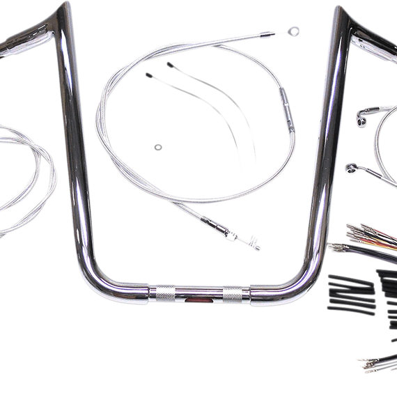 Caracteristicas: The only complete handlebar kits with matching braided cables and brake lines that include Magnum Viking Handlebars Patented Viking handlebar internal design guarantees easy installation of complete wiring harnesses without taking away from the clean look of the peak Novel design creates enough room to allow the complete wiring harness with factory vinyl covering and the terminal connections, along with their respective shrink sleeve to easily pass through without chaffing Using a unique flaring process, the burr-free internal radius creates a generous pocket of additional clearance within the troublesome peak of the handlebar To make wiring installations even easier, Magnum preloads the bars with E-Z pull-thru plastic woven sleeving Aggressive looking Viking handlebars are manufactured with the highest-quality construction, work with standard controls, including hydraulic clutch Each 1-14" diameter handlebar is CNC mandrel bent for an accurate fit, incorporates wrist angles for engineered riding comfort, has 1" diameter center sections, 3-1/2" on-center knurling and features machined control mounts (not swaged) and burr-free internal wiring holes and electronic control slots Kits include: Magnum Viking Handlebars, throttle and idle cables or Throttle-By-Wire extensions, clutch cable or hydraulic clutch line, brake lines, copper crush washers, hardware and any necessary switch or turn signal extensions Cables and brake lines feature Sterling Chromite II braid with highly-polished chrome-plated fittings All cables are a low-effort, high-efficiency design that meets or exceeds all OE specifications for fitment, construction and endurance Brake lines are compliant with DOT FMV55-106 Specifications Assembled in the U.S.A. Cable and line lengths are based on 2" risers, except for touring models Viking handlebars have a 1" diameter center section and fit 1" risers. Models originally equipped with handlebars larger than 1" will require changing the risers to a 1" ID version