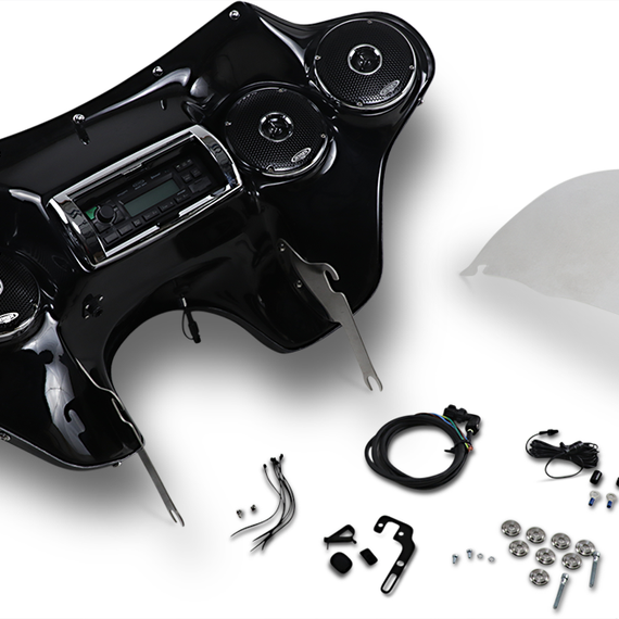 Caracteristicas: Classically styled fairing that delivers the ultimate in sound and wind protection Top-quality hand-laid fiberglass construction, gloss black gel-coated Include Jensen JHD3630BT head unit; features AM/FM/CD/USB SiriusXM capable and iPod Ready stereo with Bluetooth Stereo comes completely assembled with marine-grade weather door and four 5" pre-wired speakers Handlebar control is die cast aluminum and waterproof with rubberized buttons Concealed internal antenna for a clean, uncluttered look Easy quick-detach connection to bike's electrical system Kit includes quick-release brackets to mount on OEM windshield docking points or accessory detachable windshield docking points Includes a 12" clear windshield, will accept 96-13 FLHT OEM style and aftermarket replacement windshields (sold separately) (some drilling and trimming may be required) Made in the U.S.A. Fairings with handlebar control do not come with CD player.