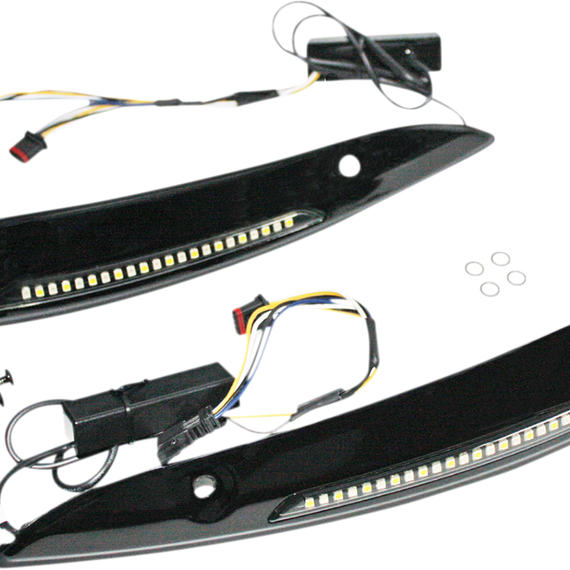• Bolts on to the stock Road Glide fairing to increase forward and side visibility with built in white DRL running light and sequential amber turn signals behind a smoked lens