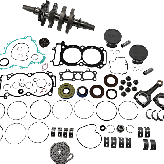 • Includes crankshaft, piston kit, complete engine gasket kit with oil seals, main bearings and seals, water pump rebuild kit, transmission bearings, countershaft bushing/seal kit, wrist pin bearing, cam chain and counter balancer bearings when applicable
