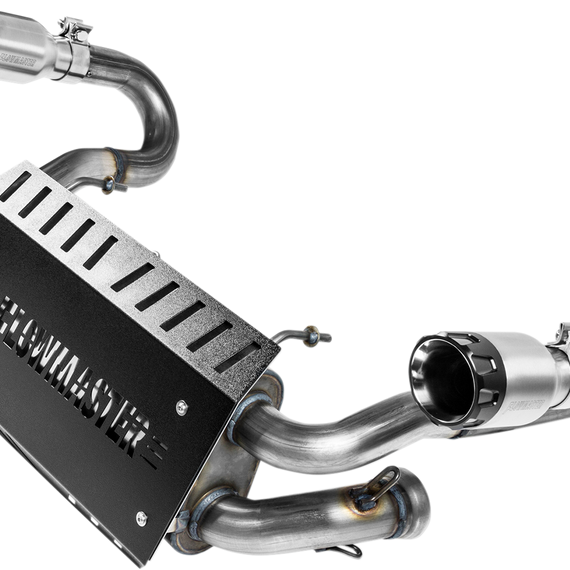 Caracteristicas: Connects at the factory flanged connection and is firmly held in place using the factory rubber mounts and springs 409S stainless steel construction, a 2.25-inch mandrel-bent inlet tube flowing into the XDR "straight-through" cross-flow performance muffler providing a deep moderate to aggressive sound level The dual 2.25-inch mandrel-bent tailpipes are tucked up high within the rear fenders, contain USFS qualified spark arrestors, and are finished off with a pair of 3.50-inch brushed 304s stainless steel tips with black anodized aluminum end caps The factory plastic heat shield is replaced with a custom designed heat shield showing everyone behind you why you sound so good Includes all hardware and installation instructions
