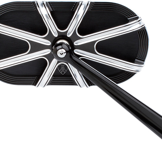 Caracteristicas: Lightweight multi-piece design Forged from aluminum then CNC-machined to perfection Stainless steel machined pivot hardware Forged mirror stem Oval Mirror heads measure 5.45" wide x 2.5" tall