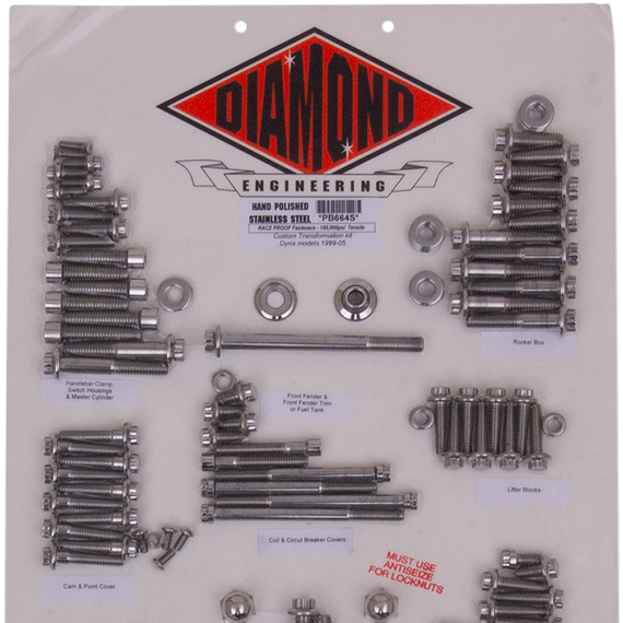 • Kits include fasteners for primary, inspections and inner primary; cam and points; oil pump or oil line cover, filter mount and sensors (Dyna and Twin Cam FLHT) or oil filter plugs and sensors (Softail Twin Cam); lifter blocks; rocker box; coil and circuit breaker covers (Dyna); transmission side cover; oil filler (FLHT models); transmission top cover; handlebar clamp, switch housings and master cylinder; front fender or front fender trim and fuel tank (FLHT models); rear fender rail or swingarm pivot blocks and rear floorboard brackets (FLHT models)
