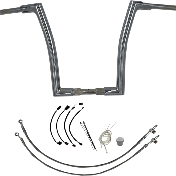 Caracteristicas: Revolutionary bolt-together  two-piece handlebar design that takes up half the shelf space, is easy to ship and even faster to install Adjustable 1-½” collar next to handlebar controls for custom look CNC mandrel-bent from 1-1/2" diameter x .095" wall heavy tube EZ install means no more need to fight internal wiring; install handlebar wiring in minutes Install kits include everything needed to install the handlebars in half the time of other kits due to our design that only extends the existing clutch cable/ clutch line and brake lines Handlebars are knurled and notched for TBW applications Made in the U.S.A. Accepts OEM heated grips Patent No. 10,946,926