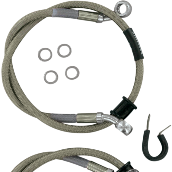 Caracteristicas: Long brake line connects to left caliper while short brake line connects to right caliper Resistance to expansion improves braking power and feel Special two-line configuration direct to master cylinder Lines clear-coated for abrasion protection