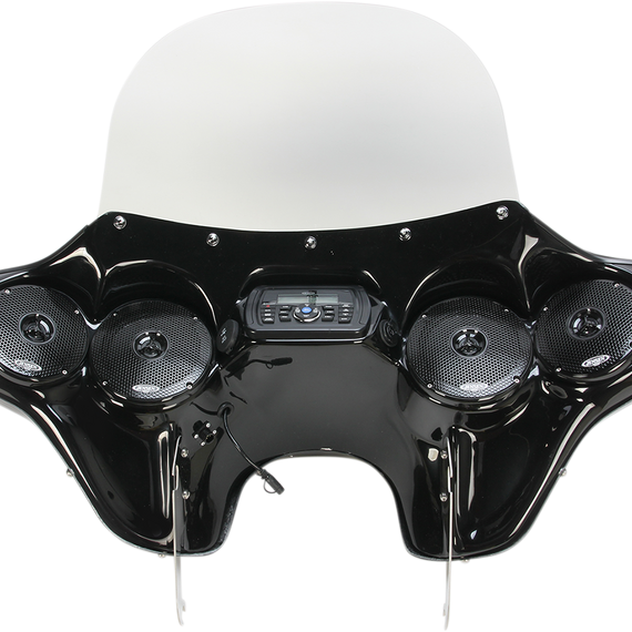 Caracteristicas: Superb wind protection, great sound with a classic style Constructed of hand-laid fiberglass making it stronger than ABS plastic and only 34 lb. Includes Jensen JHD40BT AM/FM/WB/USB Bluetooth stereo Equipped with two 5" speakers and two 6" speakers Includes a 12V power socket for charging and running accessories and a USB input port Handlebar control is die cast aluminum and waterproof with rubberized buttons Concealed internal antenna for a clean look Mounts on OEM windshield mounting points using included hardware Includes a 12" clear windshield; will accept 96-13 FLHT OEM style and aftermarket replacement windshields (sold separately) (some drilling and trimming may be required) Made in the U.S.A.