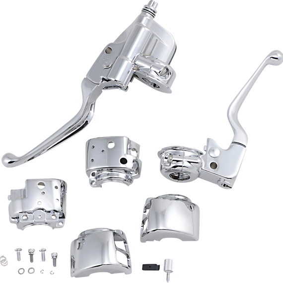 Caracteristicas: Kits include master cylinder assembly, clutch lever assembly, die-cast switch housings with radiused edges and OEM-style clamps Kits for 11-15 Softails/12-16 Dynas accept only OEM switches, all other kits accept 96-11 style switches and wiring (sold separately) Master cylinders accept OEM-style rebuild kits Not for use on models with cruise control