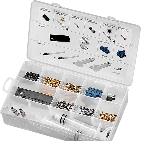 Caracteristicas: An advanced service kit for 5.0 and 5.5 mm brake hose systems Includes all the parts and tools needed to service bicycle hydraulic brakes Contains: Hose cutter, two premium syringes with thread on hoses, bleed port adaptors, bleed blocks of 2 and 4 piston calipers, and an assortment of compression nuts, olives, and barbs for both 5.5 mm hose and 5.0 mm hose Hose cutter Two premium syringes with thread on hoses Bleed port adaptors Bleed blocks of 2 and 4 piston calipers Assortment of compression nuts, olives and barbs for both 5.5 mm hose and 5.0 mm hose Hose Diameters for DH-R EVO, Quadiem, Slate T4: 5.0 mm; all other TRP and Tektro Brakes: 5.5 mm Mineral oil sold separately