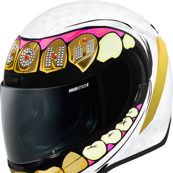 Caracteristicas: Injection molded polycarbonate shell for strength Internal airflow geometry and continuous venting system keep rider cool Fog-free Icon Optics™ shield with Rapid-Release™ system Prolock™ positive shield-locking system TracShield™ shield with tear-off posts available; sold separately Internal Dropshield with exterior switch Comfortable sculpted neck roll Removable molded breath deflector Fully removable Hydradry™ 3-piece moisture wicking liner Internal speaker pockets work with Icon's R.A.U. Bluetooth® device Does not ship with PSC or MFJ certification stickers unless purchased from an authorized dealer in that country The Dropshield™ visor must only be used while the main face shield is in the fully closed position Includes Dark Smoke & Clear Optics™ shield Includes Dark Smoke Dropshield™ Includes RST Gold Spoilers