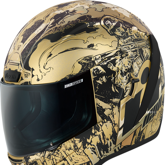 Caracteristicas: Injection molded polycarbonate shell for strength Internal airflow geometry Continuous venting system Sculpted neck roll Fog-free ICON Optics™ Shield with Rapid-Release™ System Prolock™ positive shield locking system Internal Dropshield™ with exterior switch The Dropshield™ visor must only be used while the main face shield is in the fully closed position Removable molded breath deflector Removable Hydradry™ 3-piece moisture wicking liner Internal speaker pockets work with ICON's R.A.U. Bluetooth device Includes Clear and Dark Smoke ICON Optics™ Shield