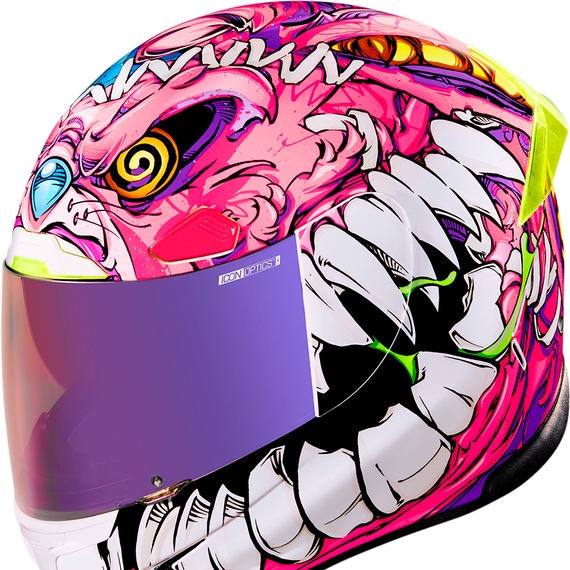 Caracteristicas: Sculpted neck roll reduces jacket/suit interference Five-piece modular liner with moisture-wicking Hydradry™ Linear ported forehead vents Low-profile vents throughout the shell Fog-free ICON Optics™ Shield with Rapid-Release™ system Prolock™ positive shield locking system Removable breath deflector and chin curtain Handcrafted composite fiberglass FRP (fiber-reinforced plastic) shell Includes clear and RST Purple ICON Optics™ shield