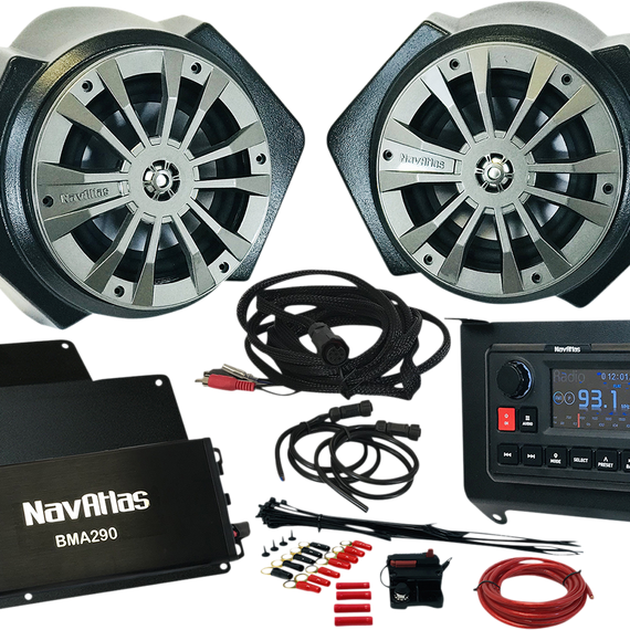 Caracteristicas: Kit includes 3" radio source unit with AM/FM/Weatherband tuner and built-in bluetooth 2 6-1/2" kick panel 200 Watts RMS speakers IP66 rated 350W full-range amplifier capable of running 4 speakers Dual amplifier bracket Installation kit with 60A circuit breaker