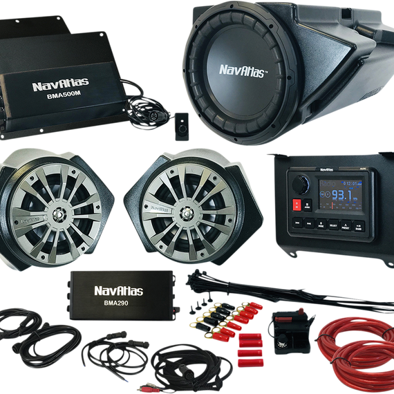 Caracteristicas: Kit includes 3" radio source unit with AM/FM/Weatherband tuner and built-in bluetooth 2 6-1/2" kick panel 200 Watts RMS speakers with an amplifier 10” 300W subwoofer and enclosure system w/ 500 W RMS mono subwoofer amplifier Installation kit with 60A circuit breaker Dual amplifier bracket Digital-to-digital cable for connecting amplifier to speakers IP66 rated